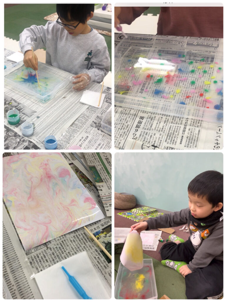 画家になろう!の活動でマーブリングをやりました。