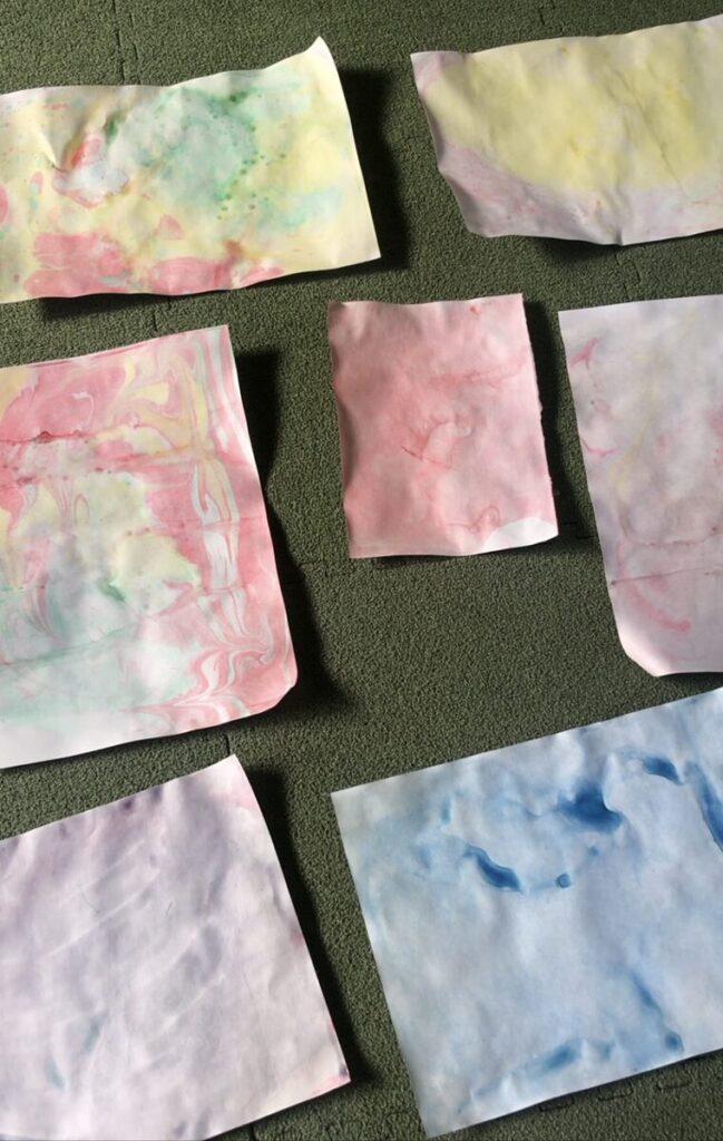 色が混ざり合って出来上がった作品をみて「きれいー」「もっとやりたいー」と何枚も映していました。