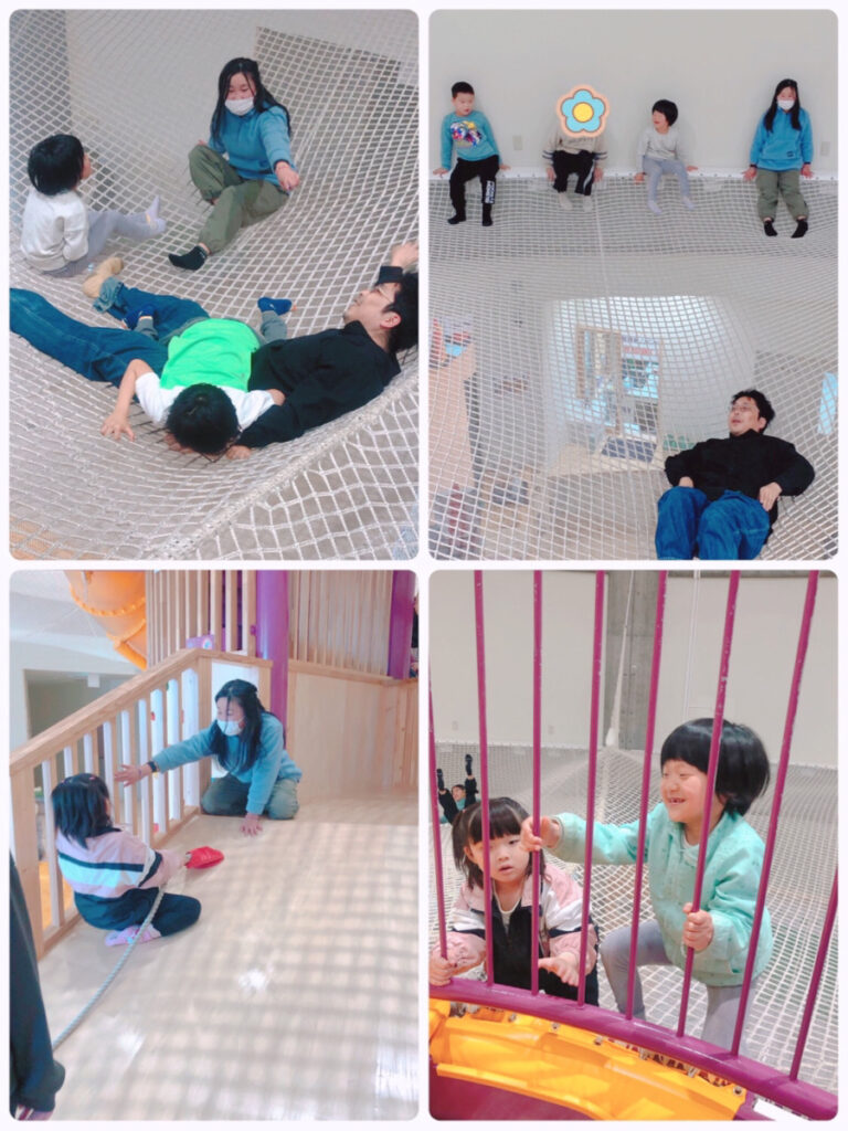 ☔️でしたが室内遊具で遊びました ✨ 13:00〜13:45の決められた時間でしたが、網の上で寝転んだり、滑りだいをしたり楽しみました。